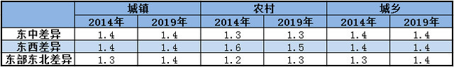 整体上看,东西区域间的差异变动不大。无论是2014还是2019年,东部基本都是其他三个区域人均可支配收入的1.4倍左右;差距最明显的,仍旧表现在东西部的农村地区。