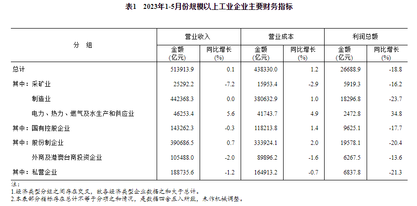 1—5月份,全国规模以上工业企业实现利润总额26688.9亿元,同比下降18.8%,降幅比1—4月份收窄1.8个百分点(按可比口径计算,详见附注二)。