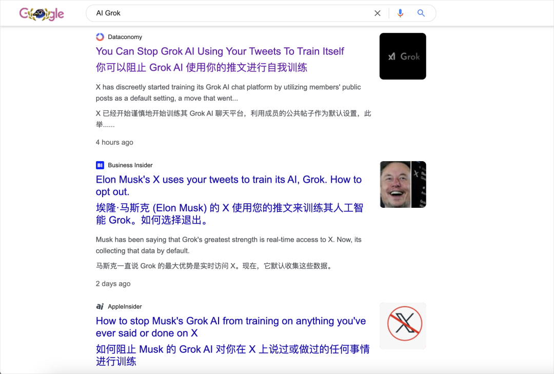 最搞笑的是,最近你去Google一下“AI”+“Grok”,出现的不再是Grok的研发进度,而是这件事,是拿用户数据训练AI的争议。