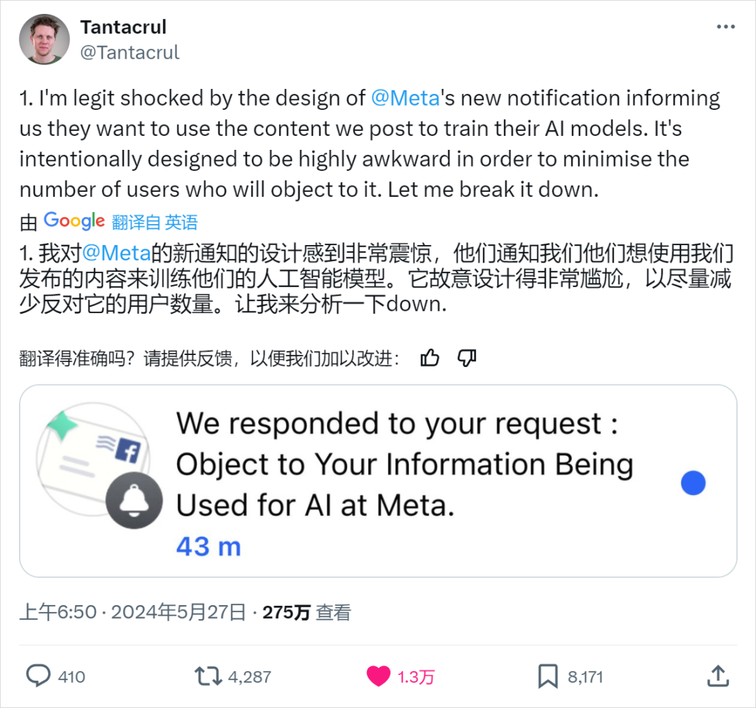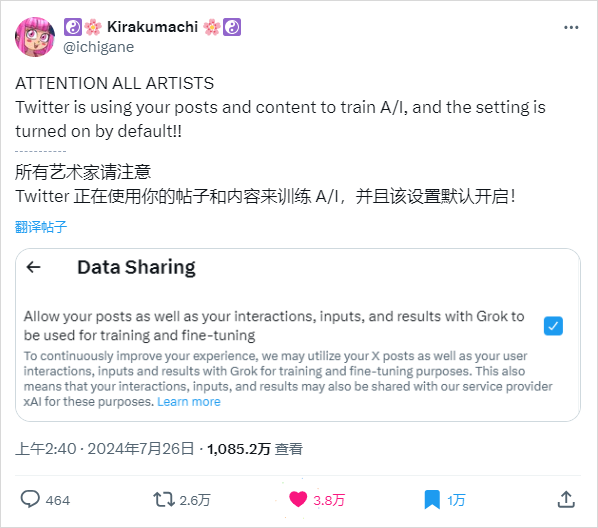 他在没有任何公告、任何通知的情况下,偷偷的上线了一个协议,就是我要用你的帖子、你的数据来训练AI啦,而且这个条款,是默认选中状态,你是默认同意的。