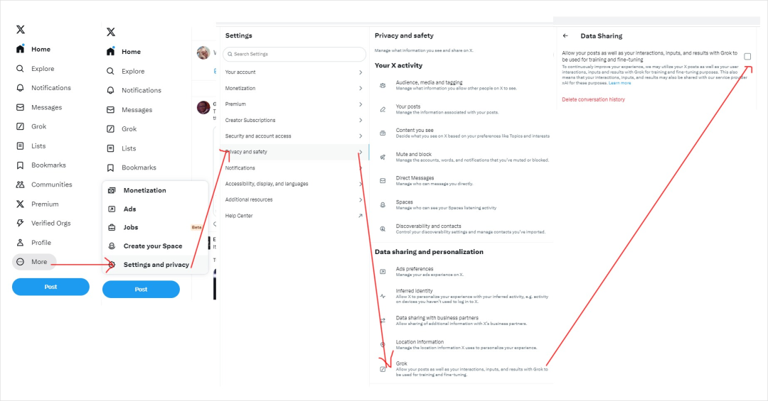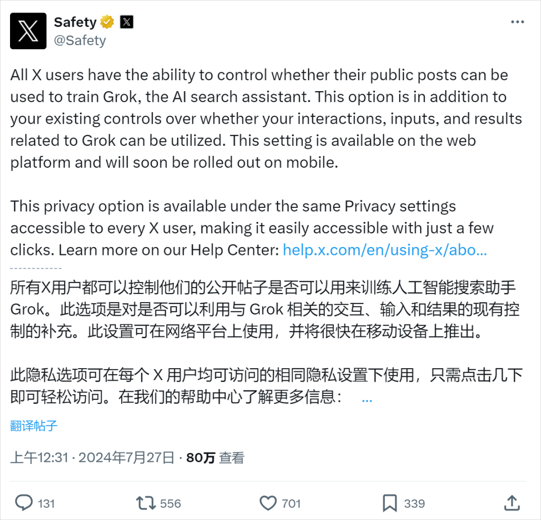 原因是:X被发现“光明正大”的拿用户的帖子来训练Grok AI。