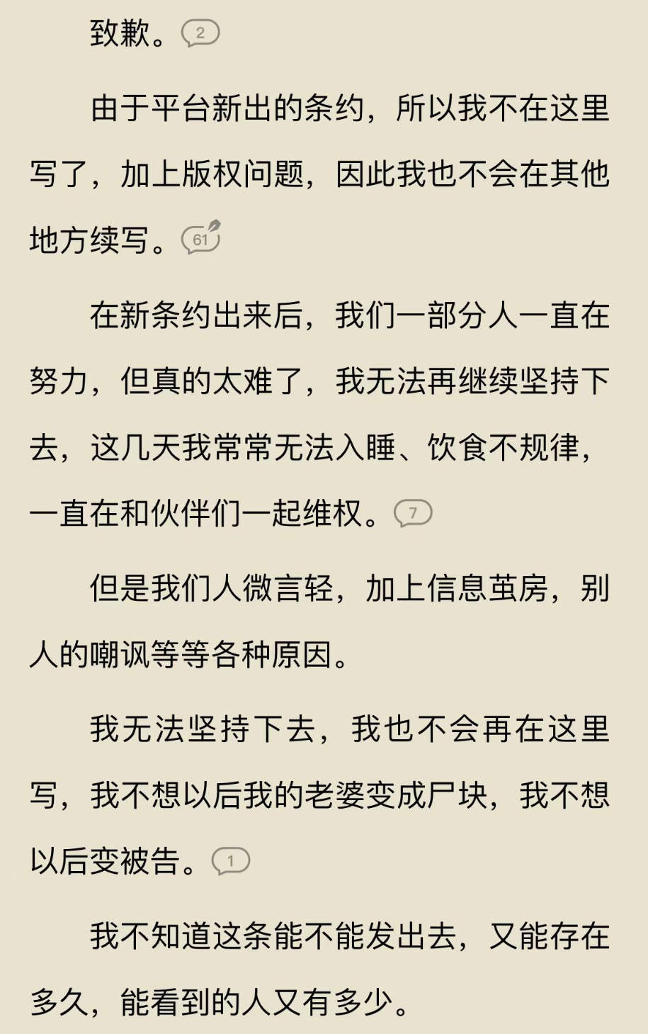 作家圈子直接就炸穿了,中下层作者纷纷加入战斗,一些万粉作家,在书内更新章节,直接写了离开番茄的声明,声泪俱下。