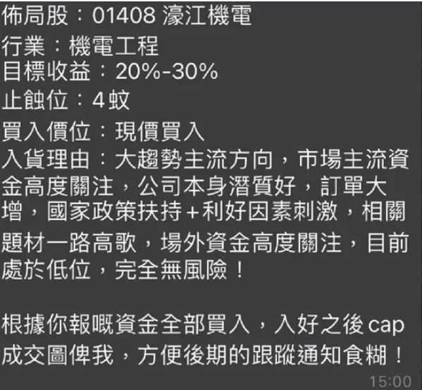 据香港媒体报道,微信女近期开始推荐这只股票,有骗徒午间要求群内成员在4.16港元挂单,又声称下午有炒股组织可将股价托至更高位。骗徒还要求组员发出自己的挂单和持仓图,谎称要研究腰部压力可支撑的资金数量,然后“左手放,右手抬”将股价托上。更有受害人指,现在已经损失400万港元。
