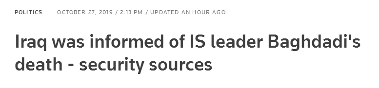 伊拉克安全部门一位消息人士则说:“我们从叙利亚境内获得的消息源已向负责追捕巴格达迪的伊拉克情报小组证实:巴格达迪试图让其家人离开伊德利卜前往土耳其边境时,他的藏身之处被发现,他在伊德利卜与私人保镖一起被击毙。”