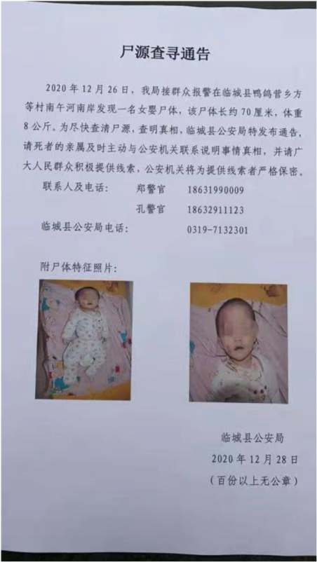12月26日,河北省邢台市临城县公安局发布通报称,接到群众报警,在当地鸭鸽营乡方等村南午河附近发现一名女婴尸体。30日,北青-北京头条记者从临城公安通报获悉,女孩系游玩过程中不慎跌落沟中致死,因父母为外地人员,秉持尸体放置于向阳且地势较高处等习俗,遂在河岸弃置。