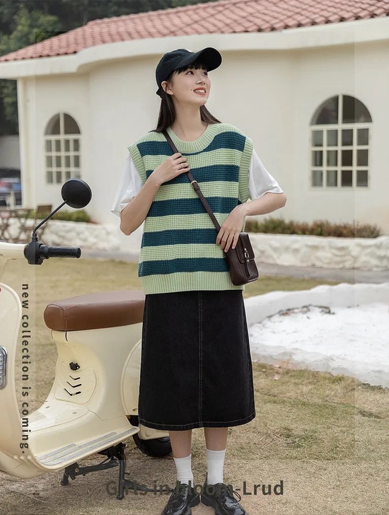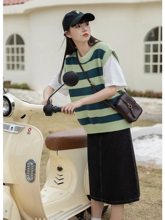 第一件背心的颜色很春天,绿色渐变款时髦度拉满,宽松的版型,搭配牛仔半裙复古感满满,对于微胖妹妹也很友好,放心入~