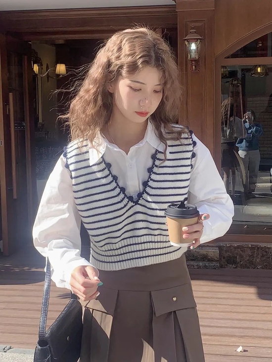 这一件比较时髦,V字领很清爽,建议内搭白色系的衬衫或者短袖,非常的青春靓丽,很有韩剧女主角的感觉哦,下半身搭配没什么限制,深色浅色都可以。
